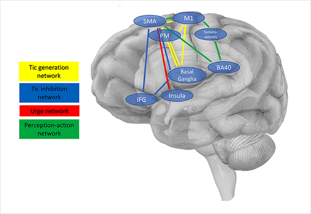 틱장애의 발병기전에 중요한 역할을 하는 것으로 전두엽, 기저핵, 일차 운동피질 및 보조 운동피질, 섬엽, 시상 등의 다양한 영역이 관여하는 것으로 알려져 있습니다. 그 중에서도 선조체에서부터 피질로 영향을 주는 전두엽과 피질하영역 사이의 연결성이 틱 증상을 발생시키는 대표적 뇌회로로 생각됩니다. 틱에 대한 기능적 뇌영상연구에서는 틱 증상에 따라서 서로 다른 활성패턴을 보인다고 알려져 있기도 한데, 한 연구에서 욕하는 음성틱을 가진 아동이 prerolandic, postrolandic area 등 언어를 관장하는 뇌영역의 활성이 보고된 바 있습니다. 이와 같이 틱 증상에 따른 뇌 활성의 변화 역시 다양하게 나타날 것으로 판단됩니다.