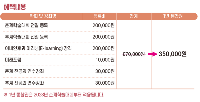 대한이비인후과에서 주관하는 학회 및 연수강좌의 등록비를 통합하여 할인 제공하는 1년 통합 등록권으로, 대한이비인후과 정회원 중 개원의 전용 혜택입니다.