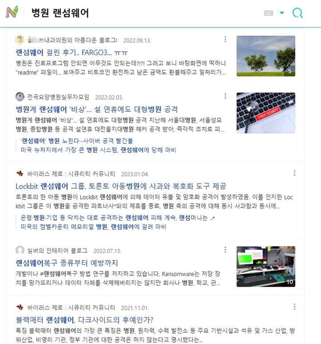 한국병원 랜섬웨어 사례들(출처 : 네이버 검색화면)