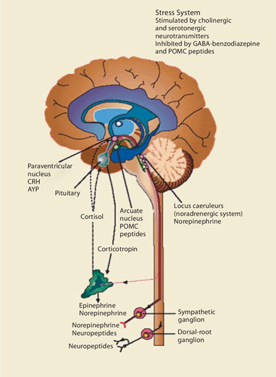 Schematic representation of the central and peripheral components of the stress system, their functional interrelations, and their relation to other central nervous system components involved in the stress response. 8