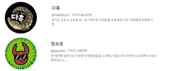 이색 동물로 검색하면 구독자 수가 가장 많은 채널은 주로 파충류, 양서류 등을 다루는 “다흑” (약 89.6만명)이나 “정브르” (약 126만명)이 나오는데, 두 채널 모두 실제 이색동물 전문 매장을 운영하고 있다고 한다.