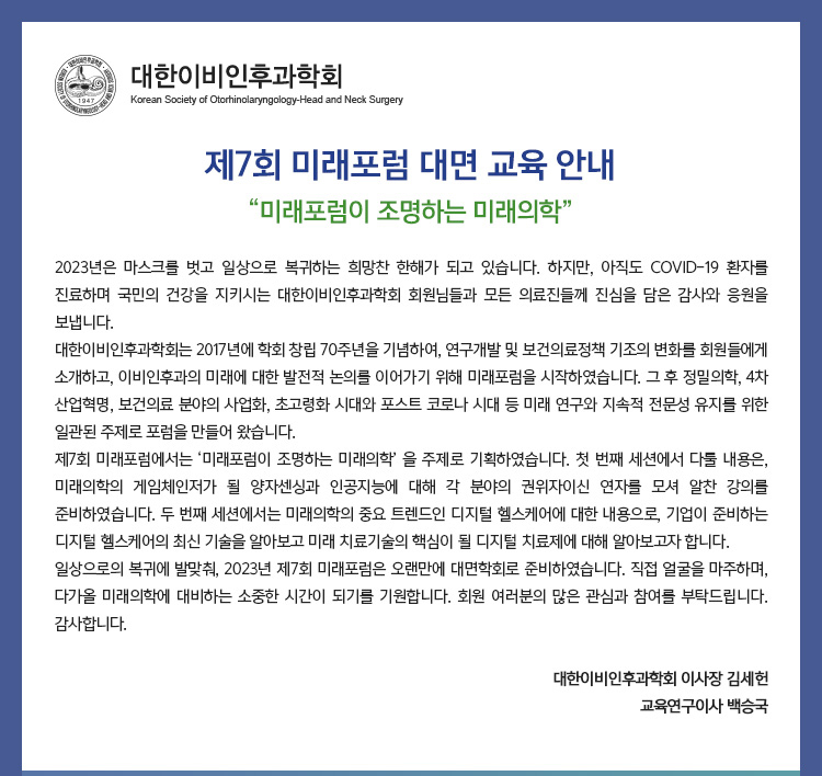 [대한이비인후과학회] 제7회 미래포럼 대면 개최 안내