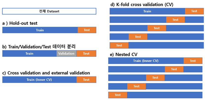위 그림에서 보다시피 전체 Dataset중 일부를 Test용으로 제외해 두고 나머지 데이터만으로 학습을 진행하는 방식이 Hold-out test입니다. 일반적으로 전체의 70% 이상을 학습데이터로 사용하게 되는데, 학습된 모델을 test 데이터에 적용한 후 그 결과를 보고하게 됩니다. 그러나, 이런 방식의 성능보고는 매우 대량의 데이터 (수 십만 case 이상?)를 이용한 경우가 아니라면 사용하지 않습니다. 우연히 학습데이터와 테스트 데이터가 기가 막히게 잘 분할되어 매우 좋은 성능이 보고될 수 있는 Bias에 대한 우려가 있기 때문입니다. 따라서 조금 더 강건한 (Robust) 결과를 보고하기 위해 이중으로 성능을 검증하는 b)와 같은 방식이나 d) Cross Validation 기법을 많이 사용하여 성능을 보고 합니다. 특히 e)와 같은 방법은 가장 강건한 방식의 검증 방법인데, 전체데이터가 비교적 적고 Computing 자원이 풍부하다면 시도해 볼만한 방식입니다. 또한, 의료 데이터에 대한 검증에 대해서는 학습 데이터를 취득한 기관 외에 다른 기관에서 확보한 데이터로 검증하는 External Validation을 많이 요구하고 있습니다. 따라서 연구를 시작할 때, External Validation을 염두에 두시길 추천합니다.