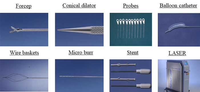오늘날 흔히 사용되는 타액선 내시경은 0도 및 약간의 유연성을 가진 시야각으로 구성되어 있으며 이는 타액선 관 내에서 조작을 용이하게 하기 위해 제작되었습니다. 단순한 진단을 위한 내시경과 기구를 통과하는 것이 가능한 병렬 채널을 갖는 치료용 내시경이 있으며, 치료용 내시경에는 포셉(forceps), 와이어 바구니(wire basket), 미세 드릴(micro drill), 레이저 광섬유(laser fiber), 풍선 확장기(balloon dilators), 가이드와이어(guide wires) 등을 넣어 중재적 시술이 가능합니다. 타액선 내시경은 지름 0.9mm에서 1.6mm까지 다양한 크기로 제공됩니다. 현재, 타액선 내시경술은 타액선에 영향을 미치는 가장 흔한 폐쇄성 병변인 타석의 제거를 위해 가장 흔하게 사용됩니다. 이전의 타석은 수술적으로 치료되었으며, 타액선을 제거하거나 타액선관을 개복하여 타석을 제거하는 방식으로 치료되었습니다. 그러나 이하선관 내 타석은 안면 신경 손상의 내재적 위험이 문제가 되어 타석을 제거하는 일이 쉽지 않았습니다. 그래서, 타석을 가진 대부분의 환자들은 적절한 치료를 받지 못해 이하선의 염증이 악화되어 통증에 고통을 받았습니다. 타액선 내시경은 이하선 타석의 치료에 큰 전환점을 야기하였습니다. 작은 타석은 타액선 내시경 자체로 제거할 수 있을 뿐 아니라 타석이 큰 경우 체외 충격파 타석 분쇄술(ESWL)을 이용하기도 하고, 때로는 레이저 광섬유를 이용하여 타석을 분쇄할 수 있습니다. 큰 타석의 경우에는 타액선 내시경과 최소절개를 이용한 외부 접근법을 동시에 시행함으로써 타석을 쉽게 제거할 수 있습니다. 소아 재발성 이하선염(Juvenile Recurrent Parotitis, JRP)은 소아에게 발생하는 원인을 알 수 없는 반복적인 이하선의 염증성 질환인데, 이러한 환자들에게도 타액선 내시경은 질환에 대한 병리생리학적인 이해를 돕고 국소 원인을 제거하는 데 도움을 주며, 스테로이드를 전달하는 치료적인 역할을 수행할 수 있습니다. 타액선 관의 협착 역시 타액선 내시경을 통해 매우 효과적으로 치료될 수 있습니다. 타액선 내시경은 협착의 위치 및 길이 등을 직접 눈으로 확인하면서 정확하게 평가하기 때문에 최적의 치료를 가능하게 합니다. 이외에도 타액선 내시경은 방사성 요오드에 의해 유발된 타액선염의 치료에도 유용하게 사용되고 있습니다. 그러나 타액선의 급성 염증 시 시행하는 타액선 내시경술은 타액선 조직의 통증과 부종이 증가될 우려가 있고, 이로 인해 관 내 시야 확보가 어려워 타액선 관 중재 시술에 영향을 주어 합병증 발생률을 증가시킬 수 있으므로 주의해야 합니다.