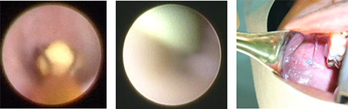 가이드 와이어를 이용한 협착의 완화(가운데), 스텐트가 삽입된 후 구강(오른쪽).
