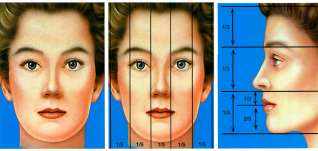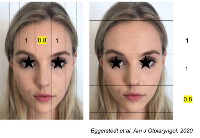 그렇다면 현재 대중에게 선호되는 얼굴은 교과서상의 이상적인 얼굴 비율과 일치할까? 이에 대해서 2020년 Americal journal of otolaryngology 에 흥미로운 논문이 게재되었다¹. 20명의 여성 인스타그램 인플루언서들의 얼굴을 분석하여 교과서 상의 비율과 어느정도 일치하는 지 비교하는 것이었는데, 결과에 따르면, 얼굴에 수직선을 그었을 때 비율은 평균적으로 눈의 길이와 내안각 사이의 길이가 1:0.8 로 내안각 사이의 거리가 약간 좁았으며, 수평선을 그었을 때 이마, 코 턱의 비율은 1:1:0.8 로 인중부터 턱 끝까지의 길이가 교과서보다 짧았다. 또한 Goode’s ratio 와 nasofrontal angle은 교과서 범위와 일치하고, Nasolabial angle은 평균 82.6도로 교과서상 여성에서 선호되는 95-110도보다 좁았는데, 그 이유는 도톰한 윗입술이 선호되는 경향에 기인한 것으로 분석하였다. 결론적으로 큰 틀에서는 교과서상의 미적 기준에 대부분 부합하나, 유행에 따라 강조되는 부위에 따라 선호되는 얼굴 비율에 변화가 있다는 것을 알 수 있다.
