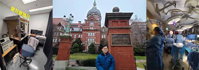 전기생리실 필자의 patchclamp rig 모습(좌), Johns Hopkins 의과대학 본관 건물(중), Hopkins 병원의 이과 수술실 모습(우)