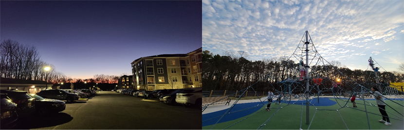 필자가 살았던 엘리콧시티 내 아파트 모습(좌); 퇴근길 노을빛이 참 아름다웠습니다. 집 근처 놀이터 모습(우).
