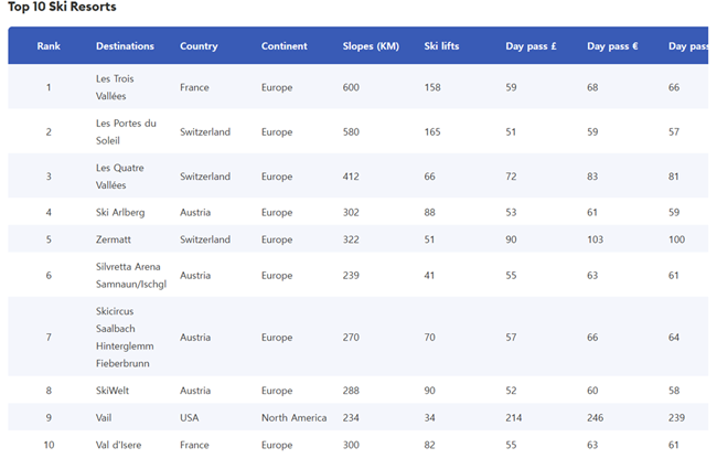 상트 안톤 암 아를베르크는 오스트리아 동부 티롤주의 동알프스 산맥에 위치한 마을로 최대 높이는 2,811 미터 표고차는 1,507미터로 2001년에 세계 알파인 스키 선수권 대회를 주최한 곳 입니다. 2024년 1월 포브스(Forbes)지가 선정한 세계 50대 스키장 중 4위에 올랐으며 St. Anton/St. Christoph, Rendl, Stuben, Lech/Oberlech, Zurs, Warth/Schrocken, Sonnenkopf 라는 별도의 스키장 마을들이 2016/17 시즌에 합쳐져서 생긴 거대한 스키장 연합체입니다. 포브스지 선정 세계 10대 스키장은 아래와 같습니다. (표 1)