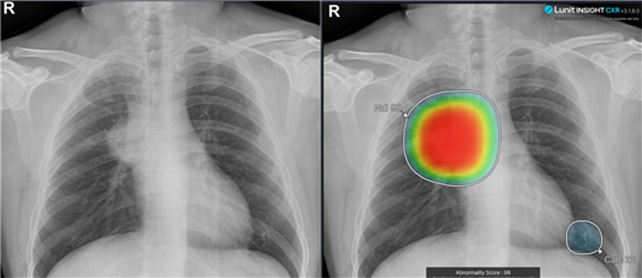 우선 실제 진료한 몇 개의 사례를 설명하고자 한다 아래 사진은 개원 후배의 진료 사례이며 촬영 후 인공지능 판독 소견에서 림프종 의심 소견이 나와 바로 상급 병원으로 의뢰하였으며 조기에 중증 질환을 발견하여 환자에게 감사 인사를 받은 사례이다.