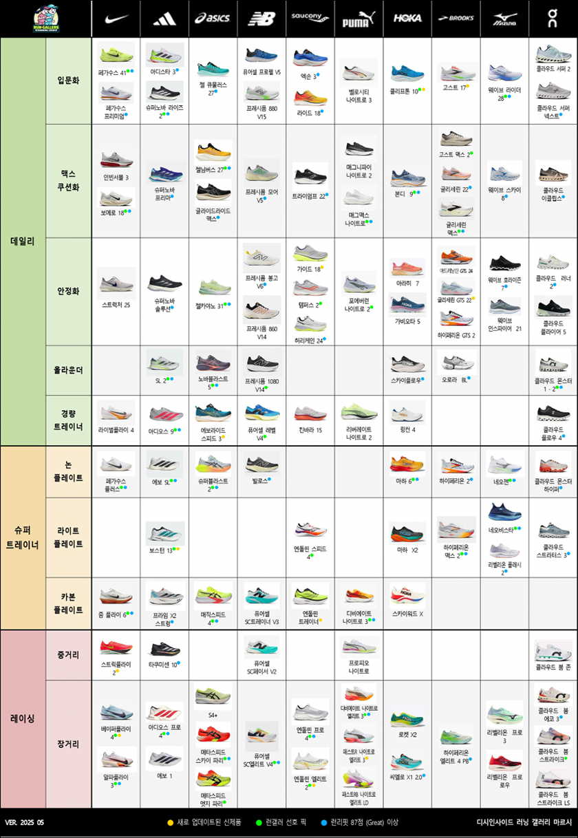 ◆ 데일리 러닝화 : 매일 부담 없이 편안하게 달릴 수 있는 기본 러닝화이러한 러닝화들의 수명은 신발의 종류, 착지법의 특징에 따라 다르지만, 보통 500km 내외라고 합니다. 따라서, 러닝화를 신고 걸어 다니는 것은 기능의 낭비와 마찬가지입니다. 저의 경우는 열심히 골라 산 러닝화를 따로 신발 가방에 챙겨 다니고, 보통 하루에 뛰는 km 수를 기준으로 단순 나눗셈을 통해 몇 년마다 바꿔야 하는지를 계산하여서 러닝화의 수명을 온전히 달리기에 투자하고 있습니다.