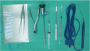 패킹용 거즈, Bayonet Forceps, 비경, 0도 내시경, 국소마취제 주사기, Joseph elevator, Freer elevator, 고주파 전극, 고주파 발생장비